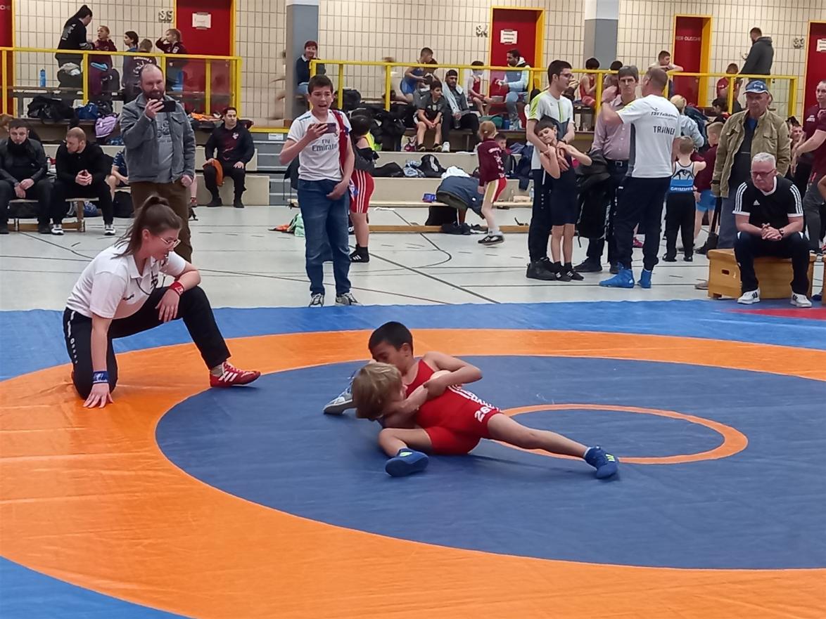 Mia Kabelitz rang bei den weiblichen Schülerinnen im Limit bis 25 Kilogramm. Sie verlor ihre Auftaktbegegnung gegen Anna Luise Behrendt (1. Hennigsdorfer RV) auf Schulter. Im zweiten Kampf stand Leonie Kreiselmeier (AE Grimmen) in der anderen Mattenecke. Kabelitz erkämpfte sich die Beherrschung in der Bodenlage. Danach setzte sie eine Bodentechnik an und gewann per Schultersieg. Kabelitz gewann damit die Silbermedaille und strahlte über das ganze Gesicht.