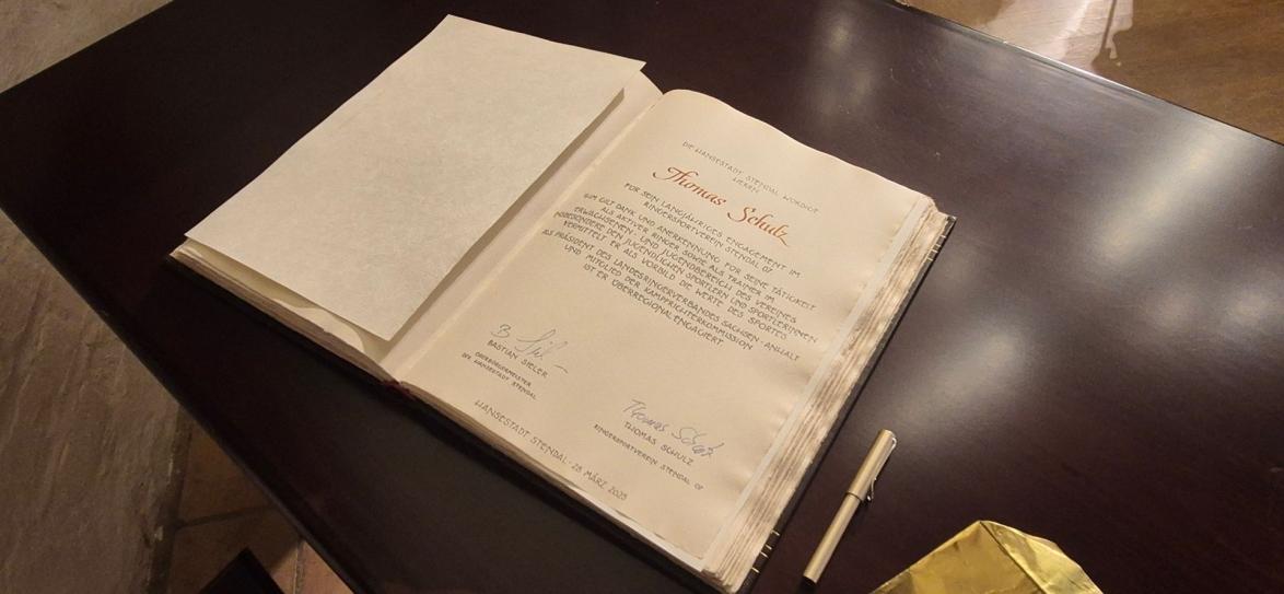 Sonntag, 13. April 2025 von RSV Stendal 07 Am 28.03.2025 versammelten sich Vertreter*innen aus Sport und Politik im Stendaler Rathaus. Oberbürgermeister Bastian Sieler ehrte verdiente Sportfreunde. Thomas Schulz war als Begleiter seines Sohnes Karl Richard Schulz, der für seine sportlichen Erfolge geehrt werden sollte, auch vor Ort. Als dann der Sportehrenpreis verliehen wurde, rief der Oberbürgermeister Thomas Schulz nach vorn.
